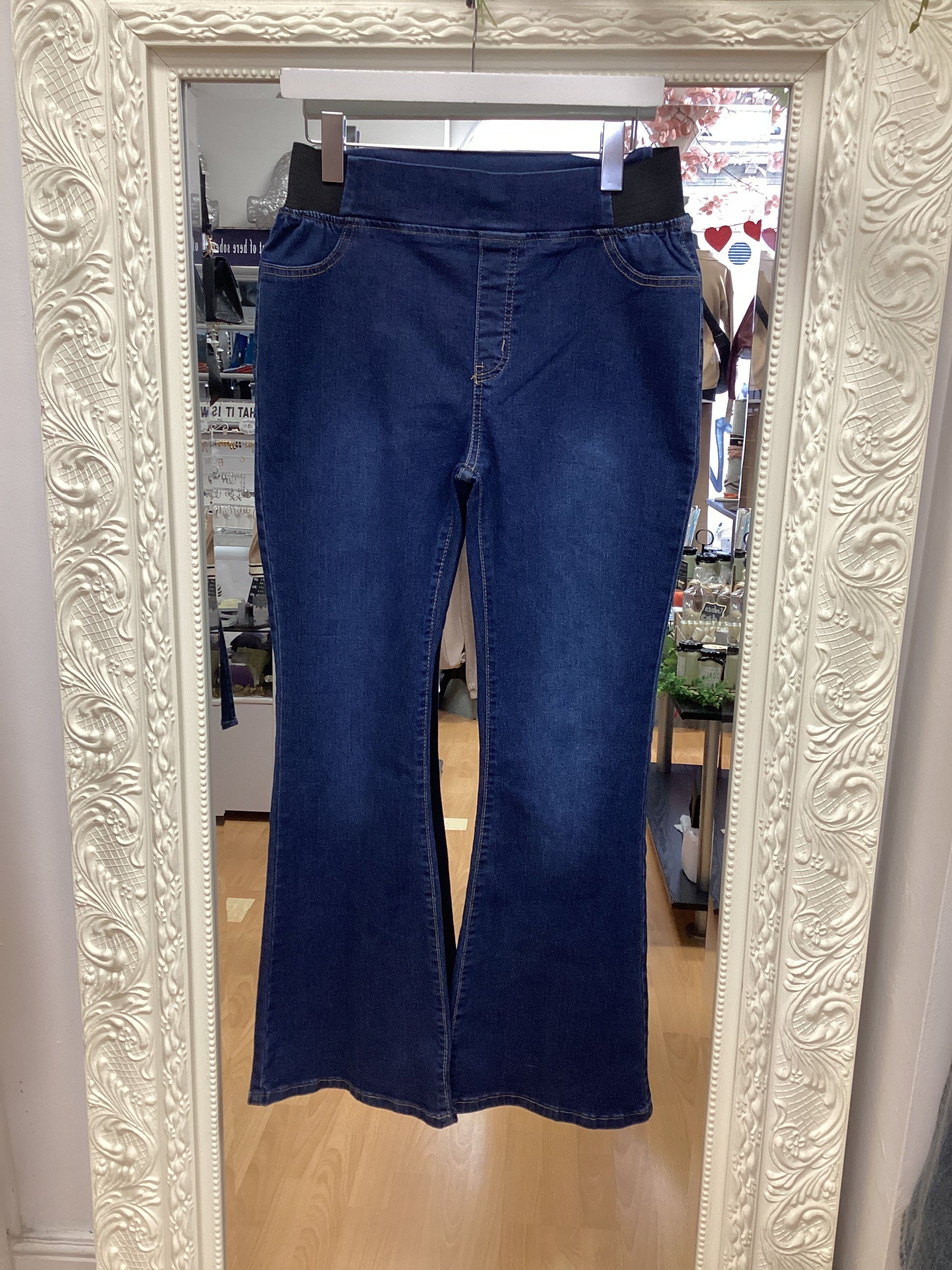 Dark denim bootcut jeans with elastic waist detail. Size L