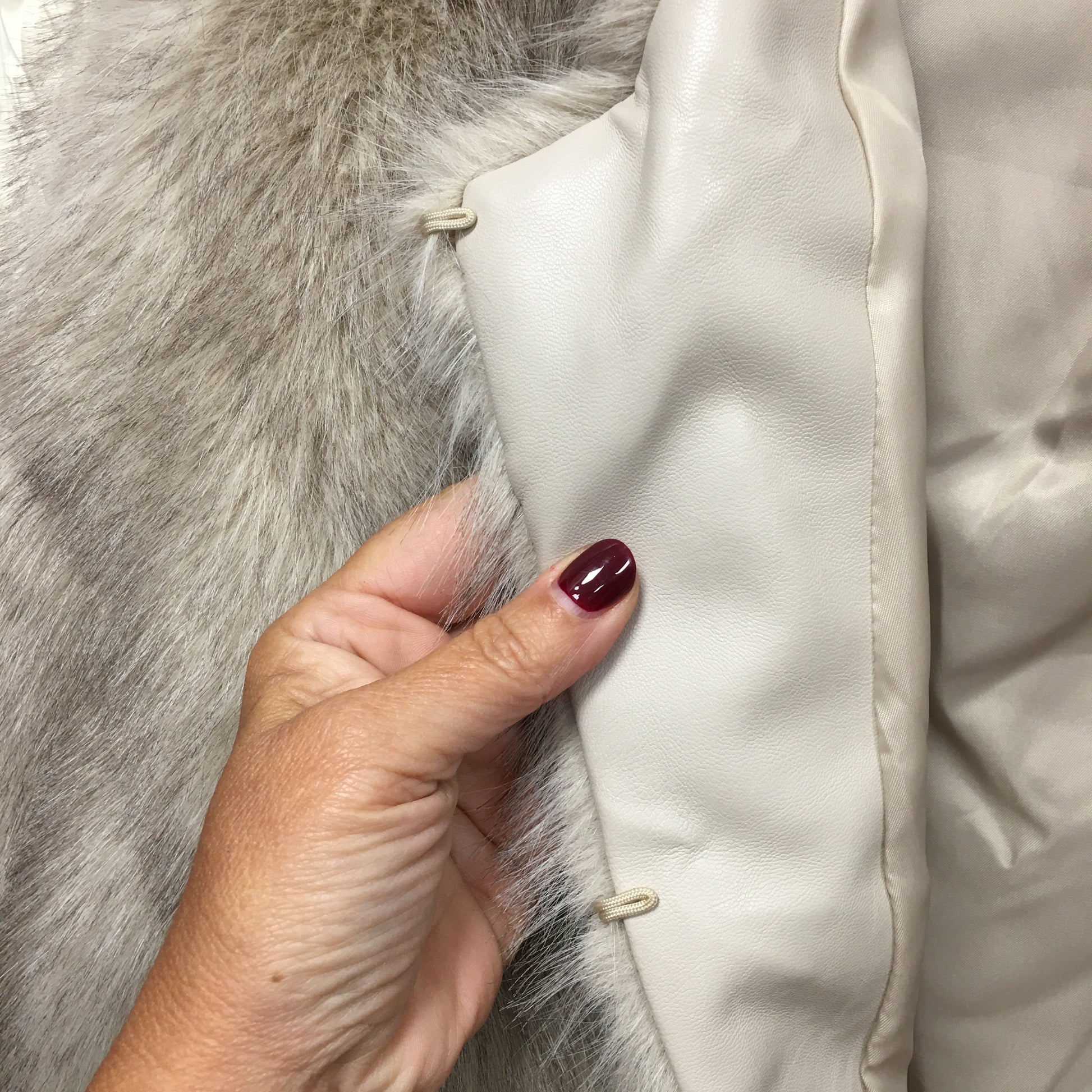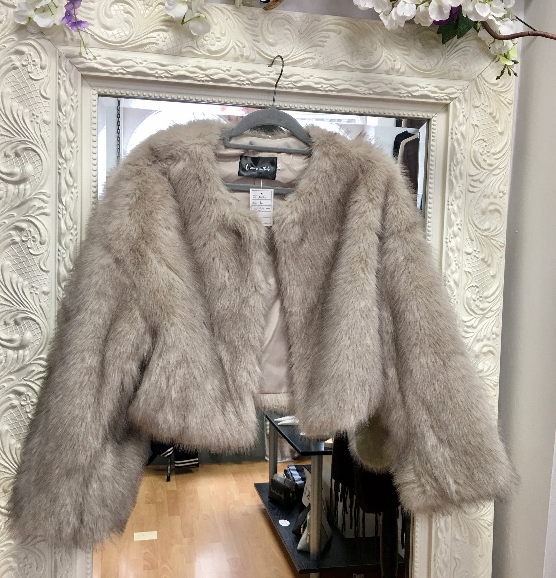 Short faux fur jacket fully lined with pockets & hook & eye fastening. Two sizes available.