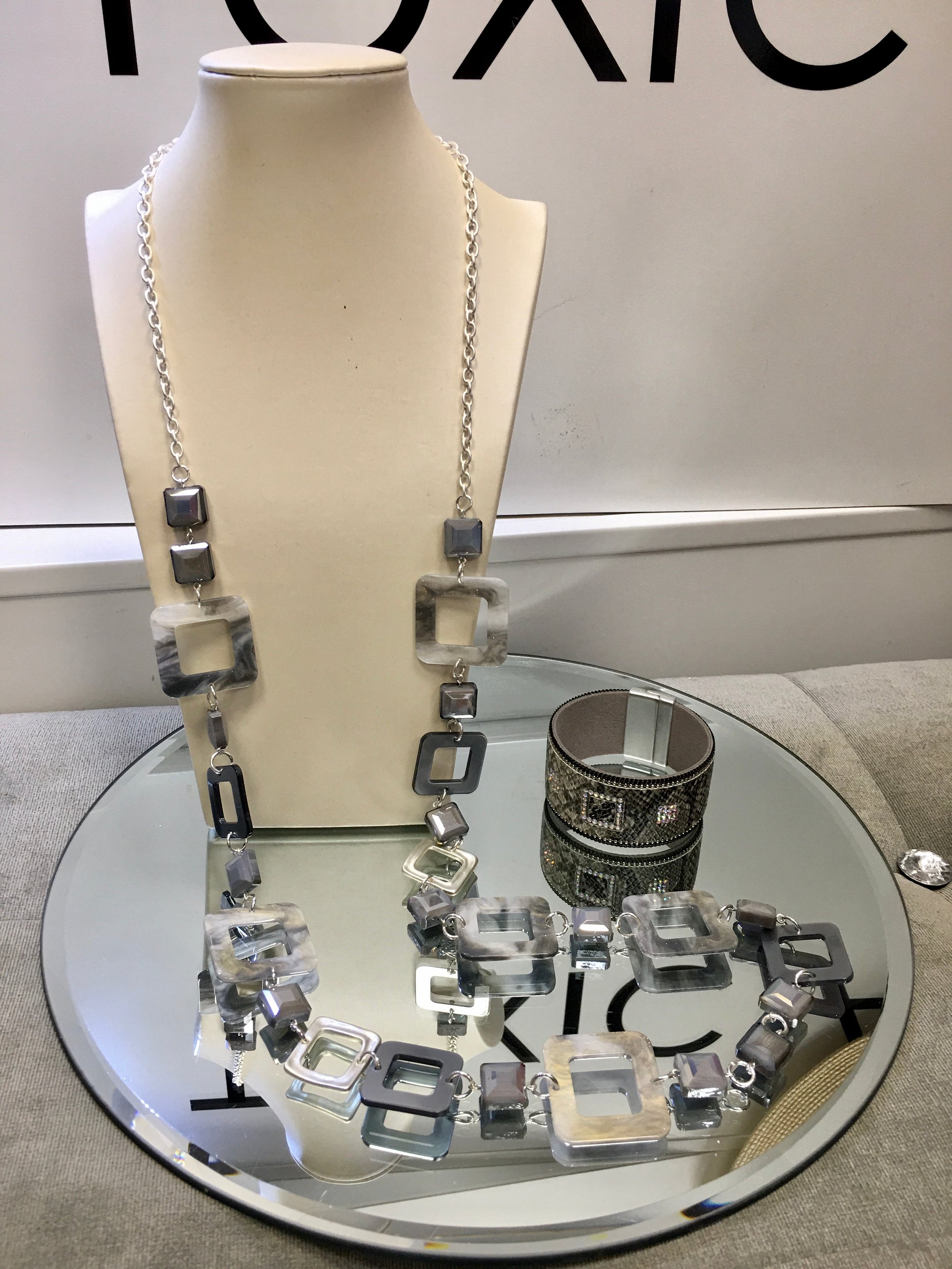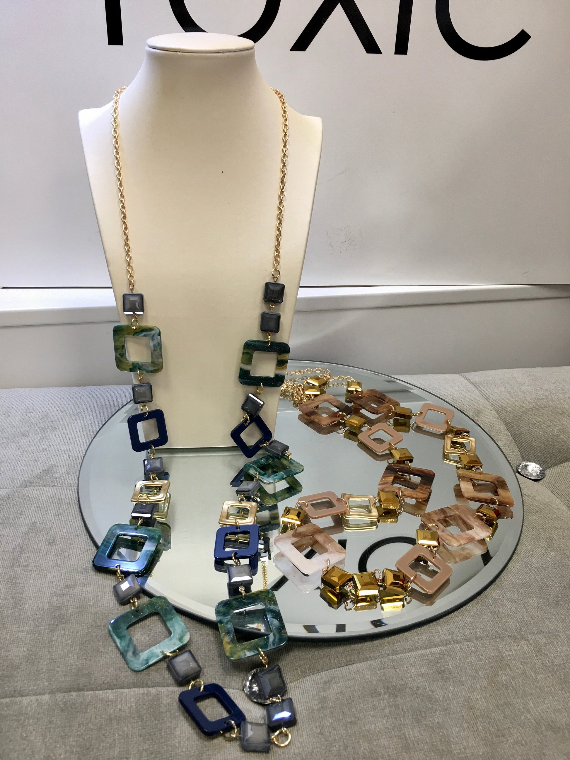 Long statement necklace with adjustable gold chain in an unusual square design. Available in 3 colours.