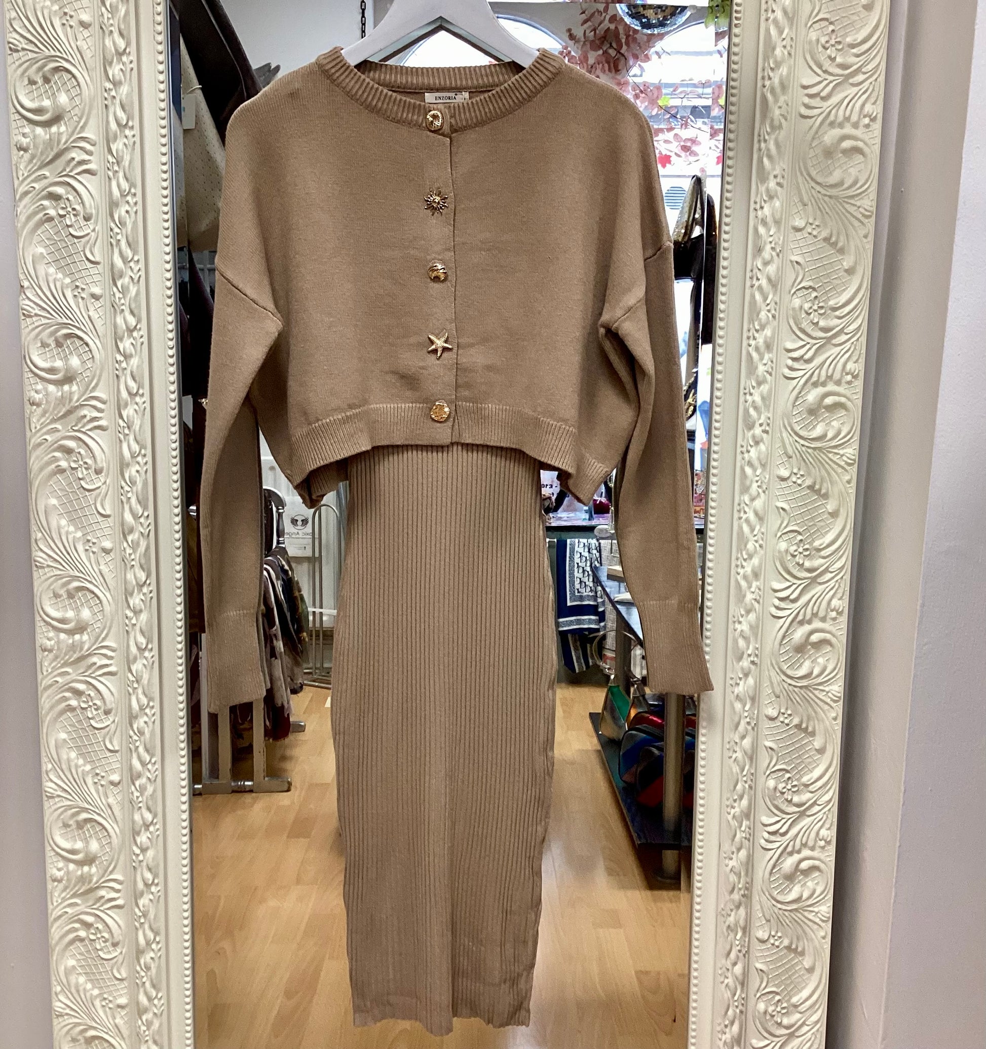 2 piece dress & short cardi set. Cute gold button detail. Free size fit up to 12-14.