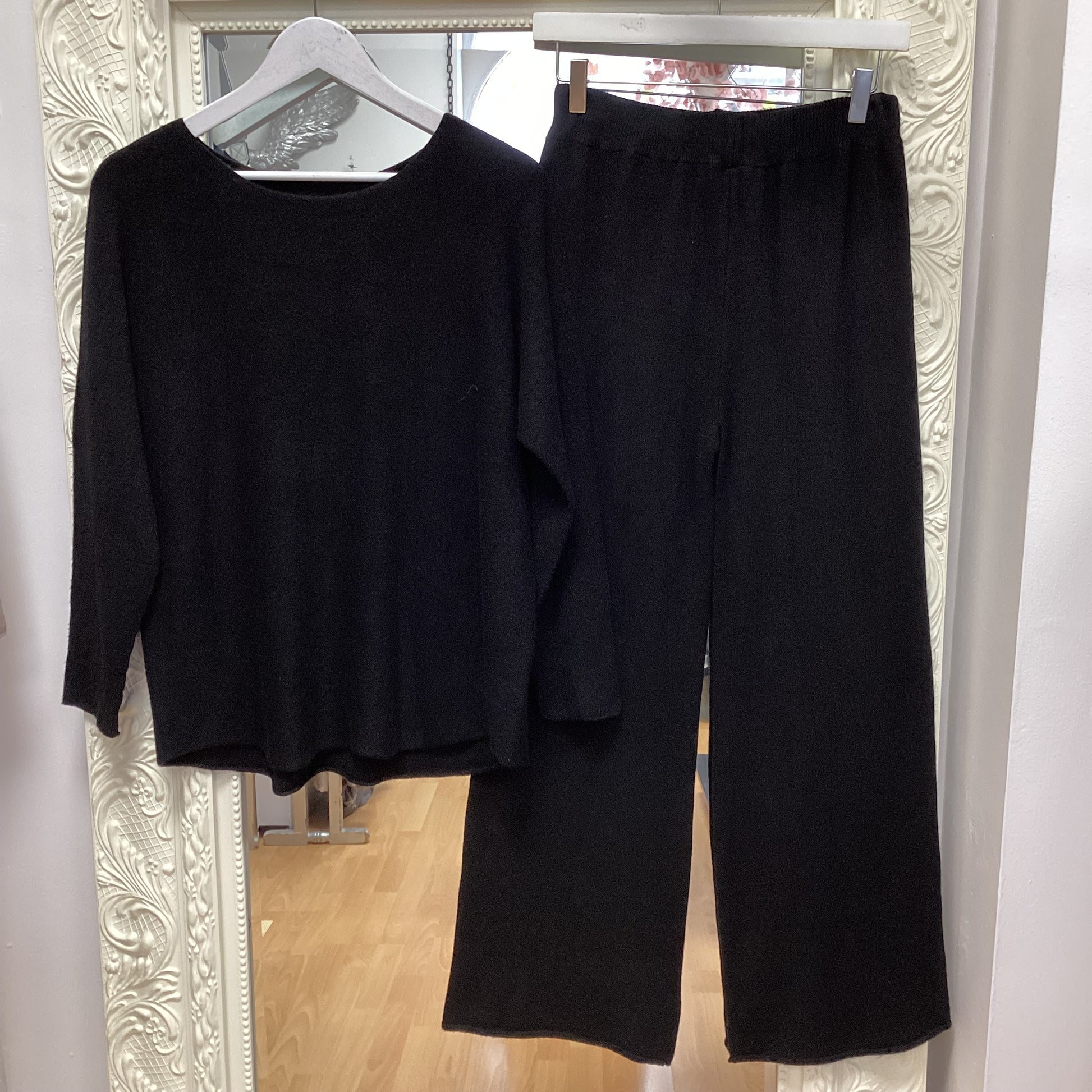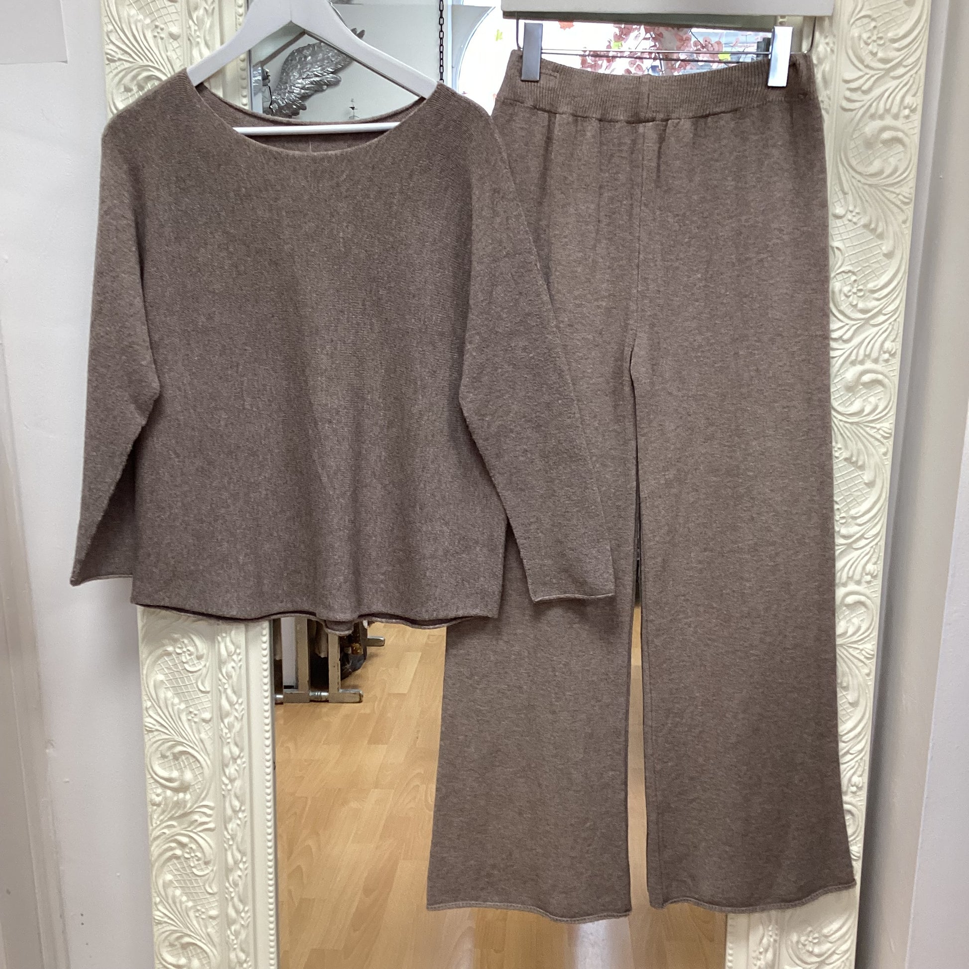 Knitted trouser set. Trousers have elasticated waistband. Free size fit up to a 16.