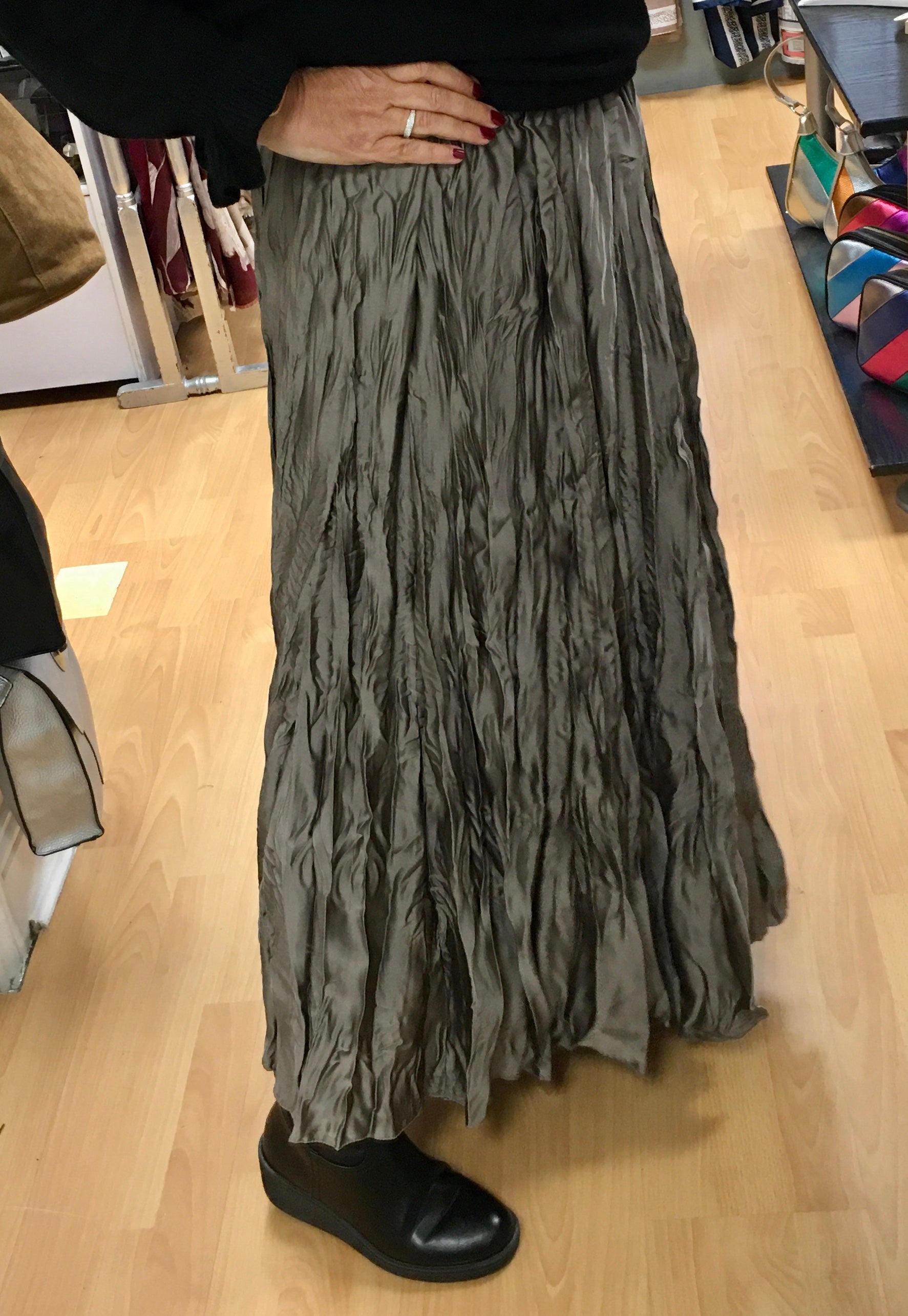Crinkle effect satin maxi skirt with elasticated waistband. Free size fit up to a 16.