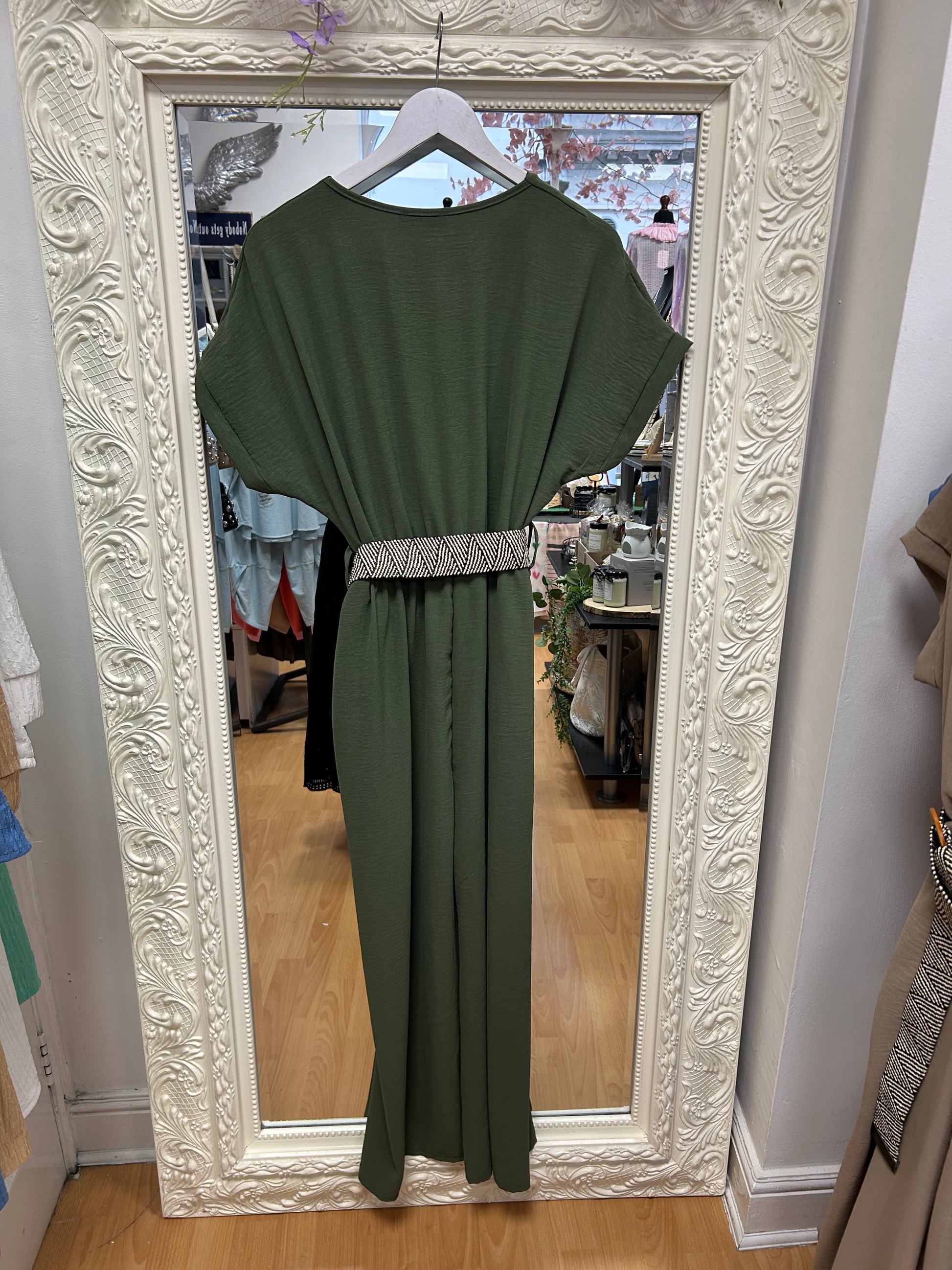 Jumpsuit with woven belt. Free size fit up to a 14.