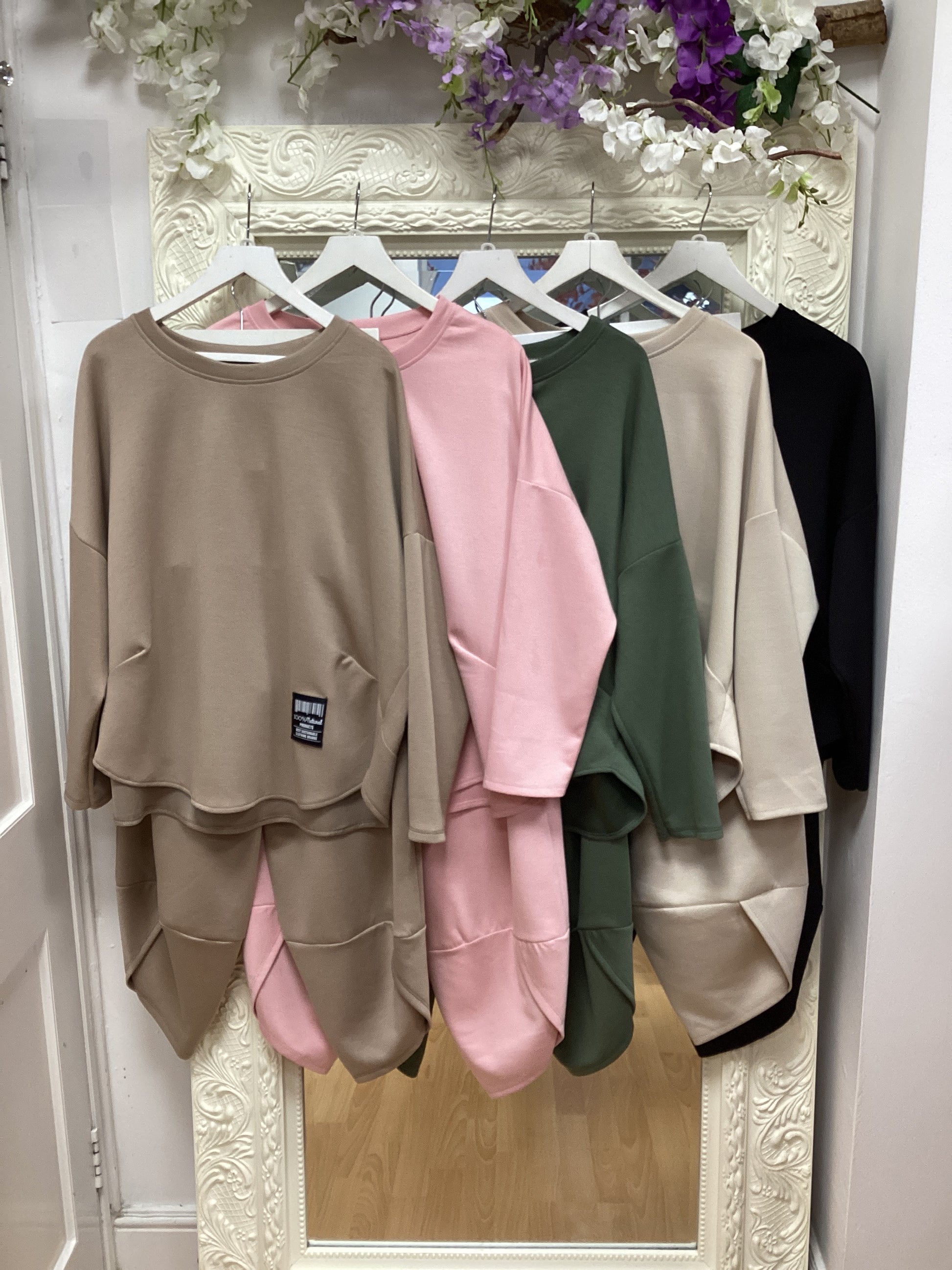 3/4 trouser set in soft scuba material. Free size fit up to a 16-18.