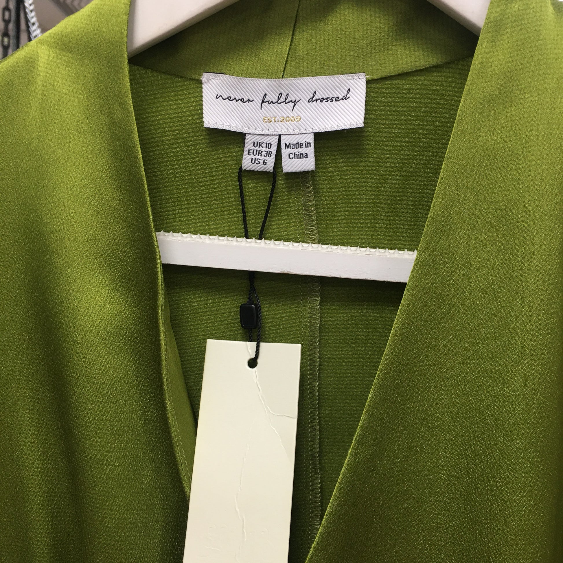 NEVER FULLY DRESSED satin wrap round dress in olive green. Size 10