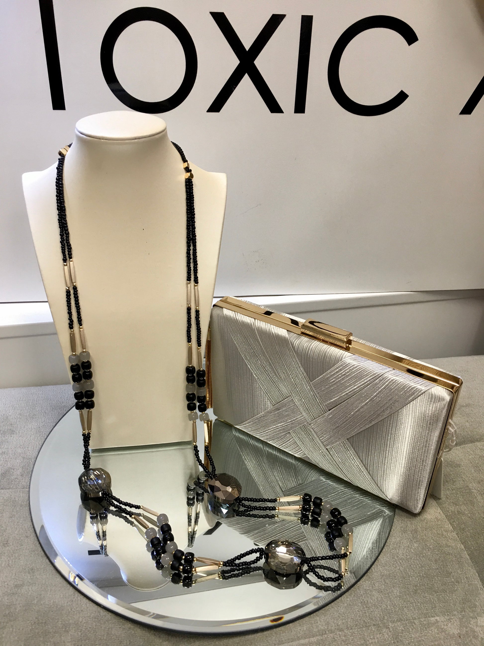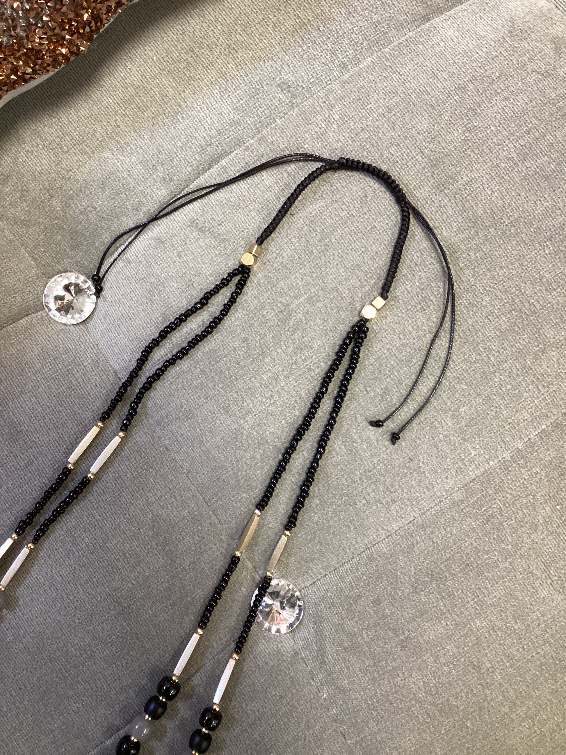 Long necklace with string pull to adjust length. Large gems with gold detail adorn this statement piece.