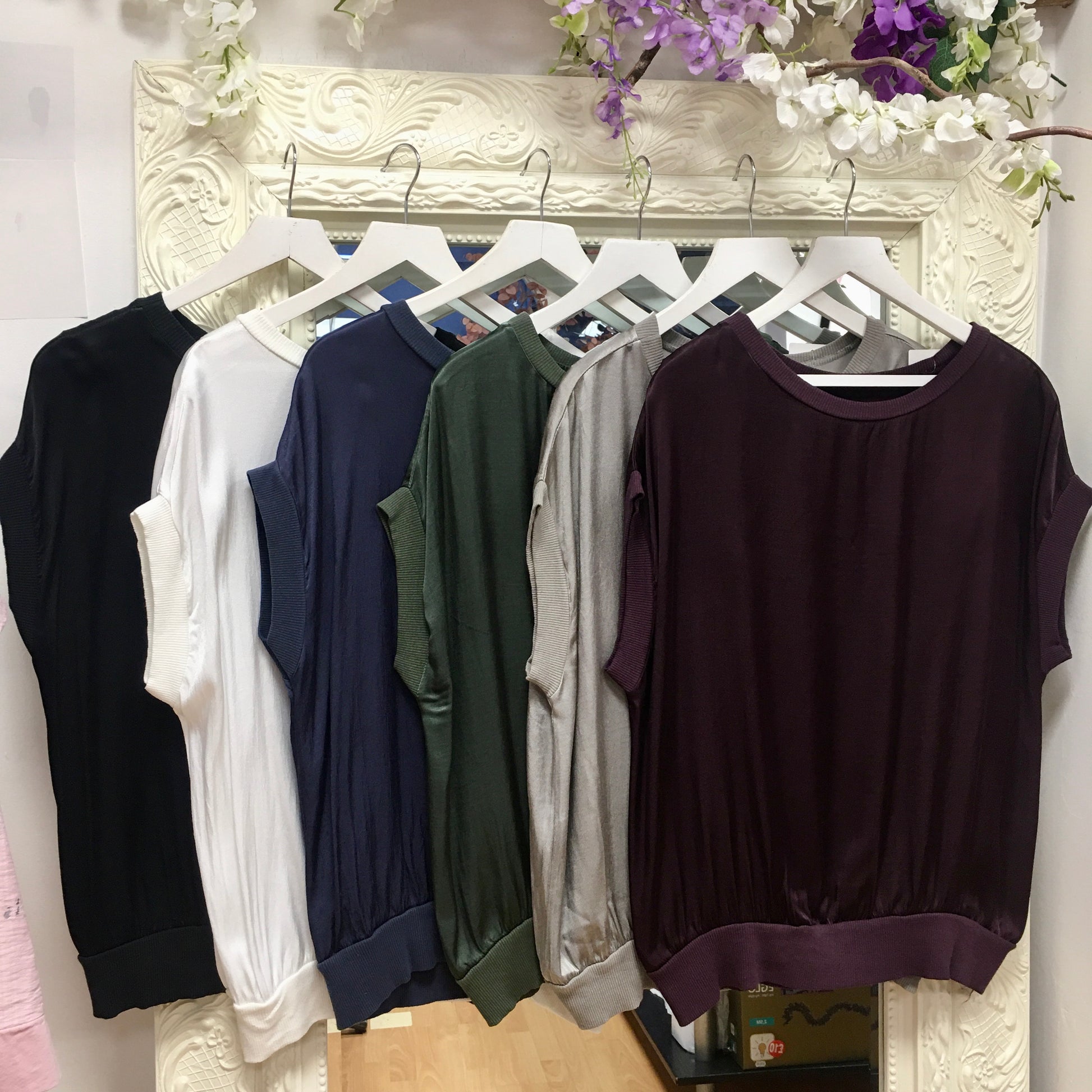 Our best seller. Satin feel top with jersey cuff & hem detail. Free size fit up to a 16.